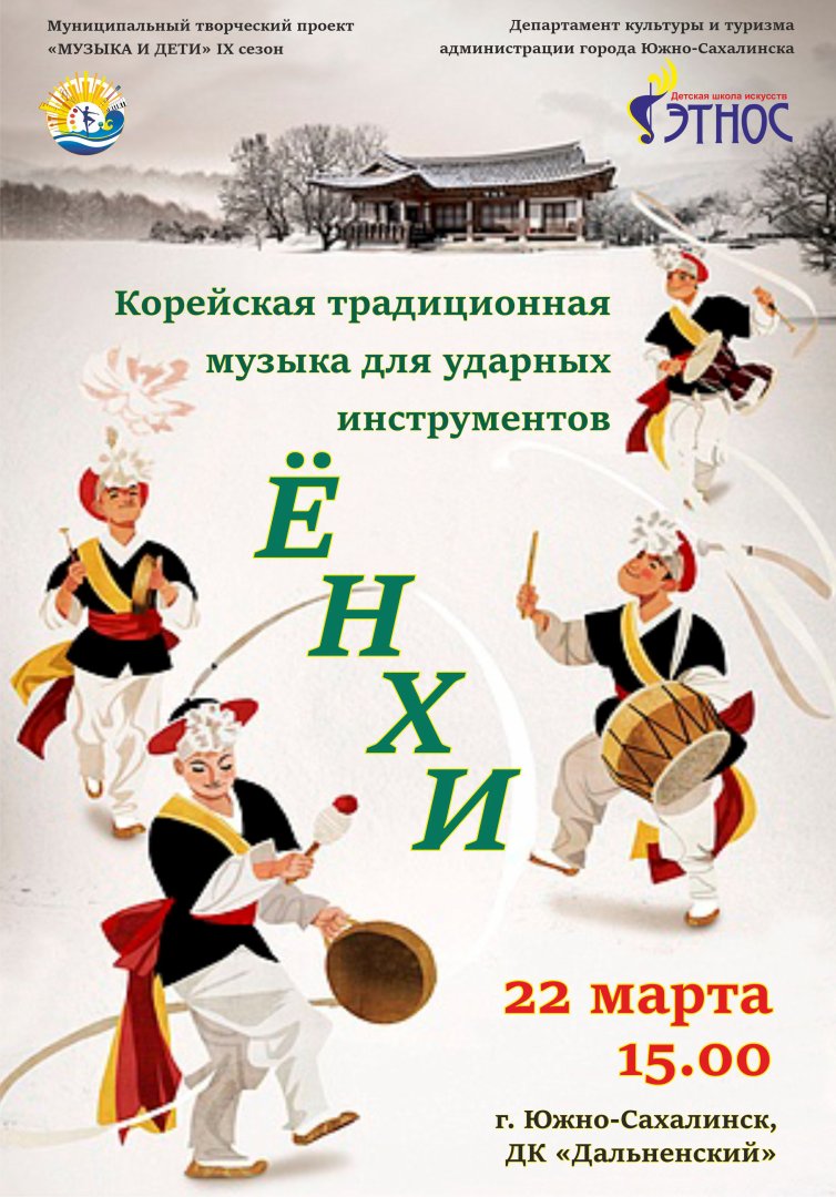 22 марта 2023 года в 15:00 на сцене Дальненского дома культуры, в рамках муниципального творческого проекта «Музыка и дети», ДШИ «Этнос» представит концертно-просветительскую программу «Ёнхи- корейская традиционная музыка для ударных инструментов» .