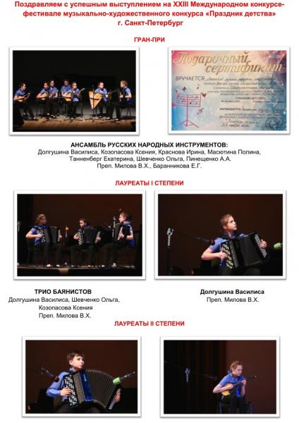 Поздравляем с успешным выступлением на XXIII международном конкурсе-фестивале музыкально-художественного творчества "ПРАЗДНИК ДЕТСТВА" г. Санкт-Петербург