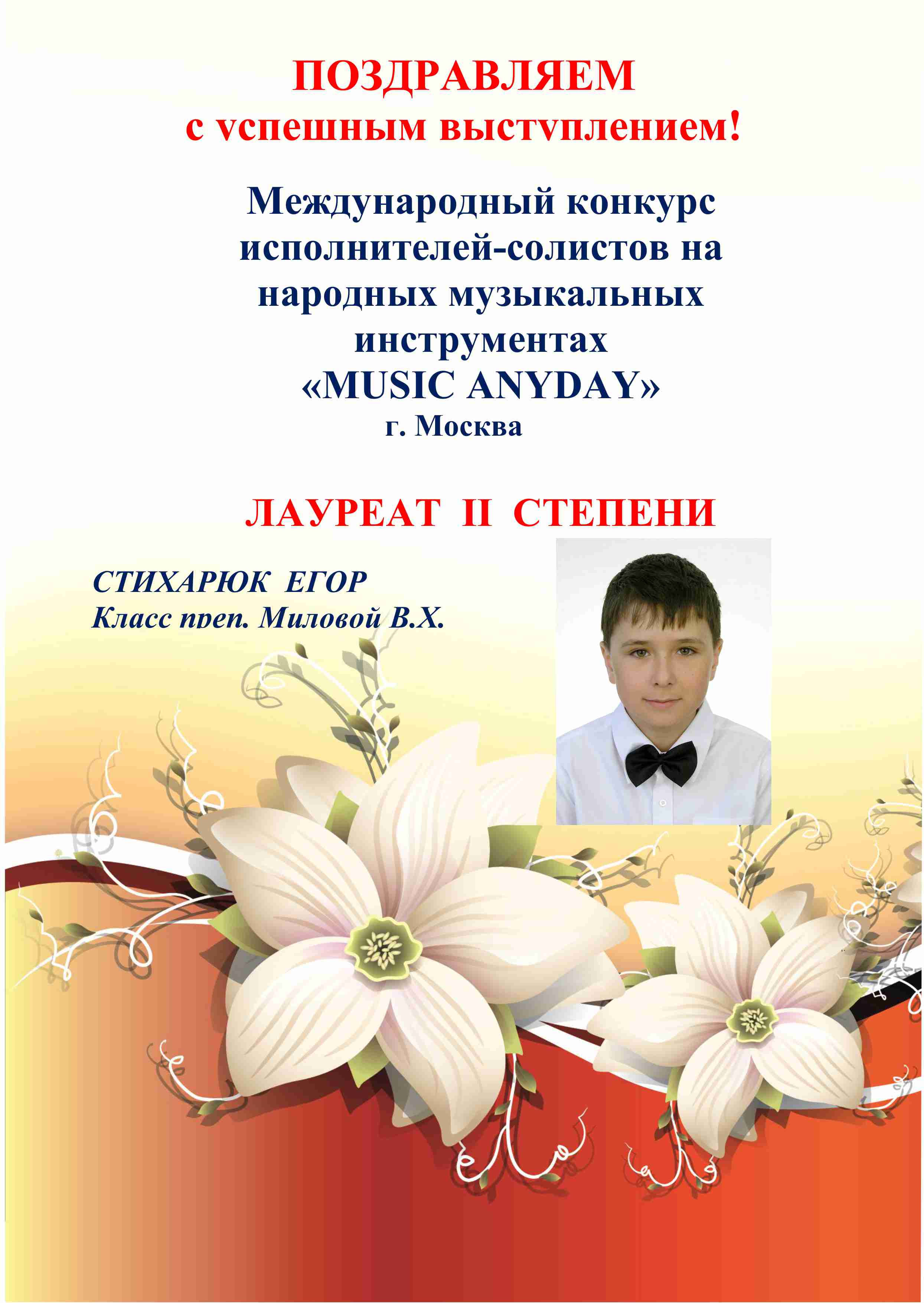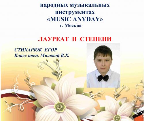Поздравляем воспитанника ДШИ "Этнос" Стихарюк Егора с успешным выступлением на Международном конкурсе исполнителей-солистов на народных музыкальных инструментах "MUSIC ANYDAY"